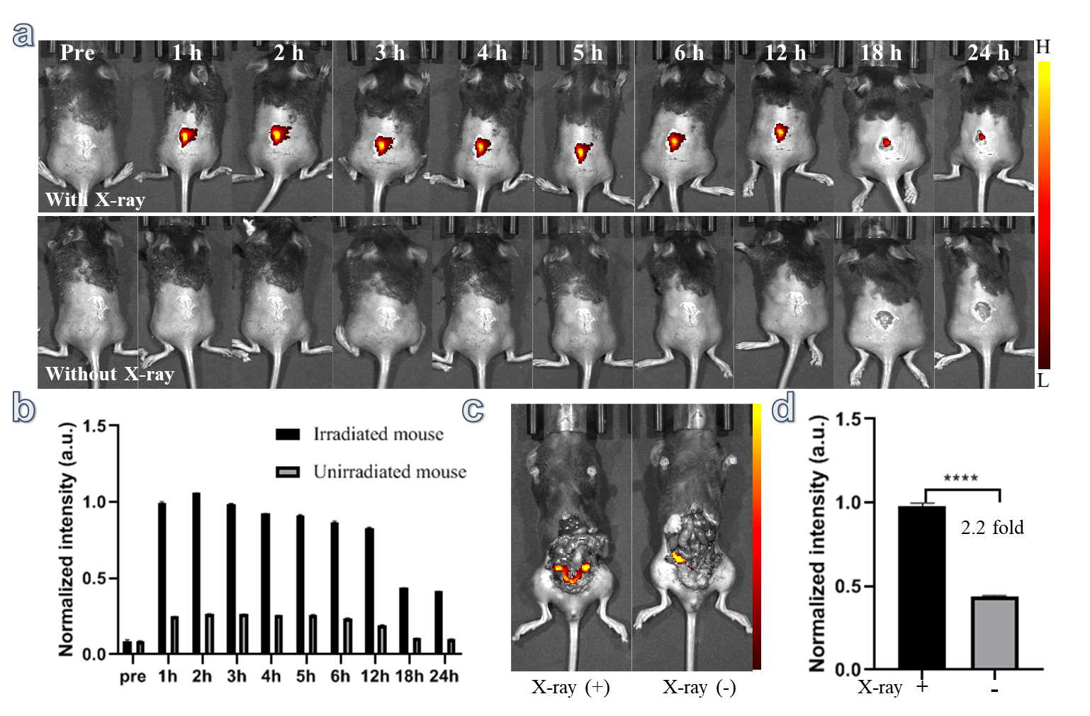 在最新的研究进展中,史海斌教授课题组创新性提出设计并构建了一种Caspase-3特异性激活型小分子荧光探针(CGK(QSY21)DEVD-Cy5.5),将其成功地应用于小鼠胚胎凋亡过程的实时可视化和发育评估研究。该探针主要由近红外荧光染料Cy5.5、荧光猝灭剂QSY21和Caspase-3酶特异性识别和剪切的底物Asp-Glu-Val-Asp (DEVD)三个部分组成。细胞实验研究证实,探针可以被化疗药物顺铂或X射线照射诱导发生凋亡的胚胎中Caspase-3酶特异性剪切,释放出明亮的近红外荧光信号。进一步在小鼠模型中,经过X射线照射的小鼠子宫内,探针表现出明显增强的近红外荧光,通过活体荧光扫描,可以对胚胎的凋亡情况进行实时无创的示踪,克服了以往胚胎生长发育质量评价方法的诸多缺点。该研究成果有望为胚胎发育情况的无创可视化评估提供新手段。