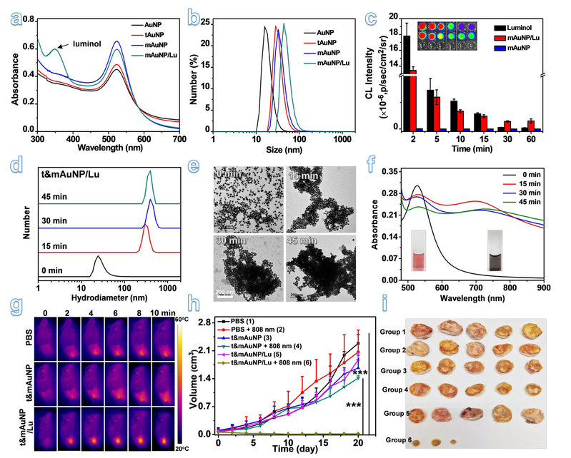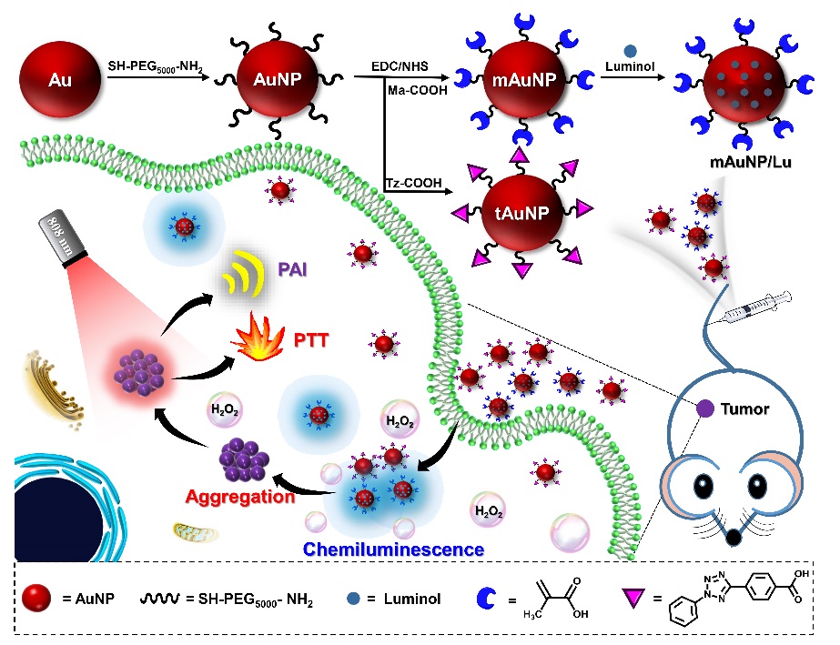 金纳米颗粒是一种很有应用潜力的光热治疗剂。一般直径大于50nm的纳米球才能有较强的近红外吸收从而适用于光声成像和光热治疗(PTT)。然而,大量研究表明尺寸较小的颗粒更适合于肿瘤的诊断与治疗。为了克服上述矛盾,发展使小尺寸纳米金在肿瘤病灶选择性聚集或自组装的新方法对于提高纳米金的诊疗效果和生物安全性意义重大。近年来,利用刺激体触发纳米金聚集,如含硫醇分子、酸性pH环境、疾病相关酶,DNA和光等,被广泛报道。肿瘤微环境产生的内源光(包括化学发光和生物发光)能够克服外源光激发的组织穿透能力弱的局限性,是一种非常有前景的刺激体,已被应用于深部活体生物成像和药物可控缓释等研究。