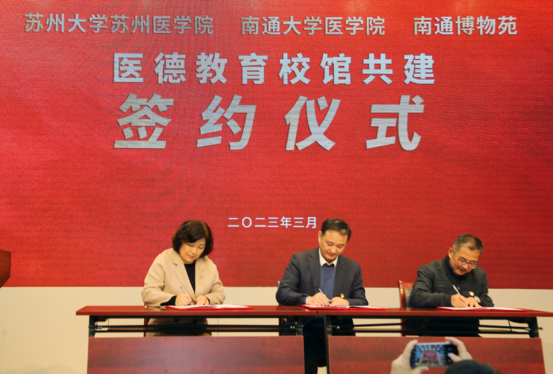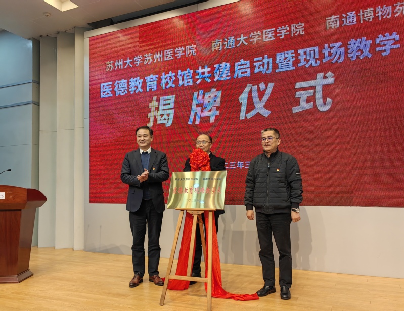 为全面学习贯彻党的二十大精神,落实习近平总书记在南通博物苑参观张謇生平展陈时的重要讲话精神,培育兼具过硬技能与高尚医德的医学人才,推进新医科建设与医学文化传承,经苏州大学苏州医学院党工委、南通大学医学院党委和南通博物苑党支部三方友好协商,3月17日下午,在南通博物苑举行医德教育校馆共建启动暨现场教学点揭牌仪式。南通大学校党委常委、副校长杨宇民,苏州大学苏州医学院党工委书记钱福良,南通大学医学院党委书记史亚琴,南通博物苑党支部书记、主任杜嘉乐出席活动。仪式活动由南通博物苑副主任彭春梅主持。