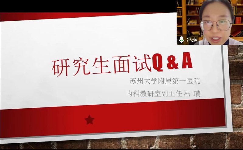 毛海青主任希望同学们保持平和放松的心态和积极进取的状态做好面试准备,注意英文专业文献阅读积累,面试时进行有效沟通。杨玲主任提醒同学们要着重加强对所报科室、所报导师的了解,夯实大临床的基础知识,提升所选方向的专业素养,做到胸有成竹!冯璜主任从面试场景、面试流程、面试框架和面试准备等四个方面进行了系统全面的解答。