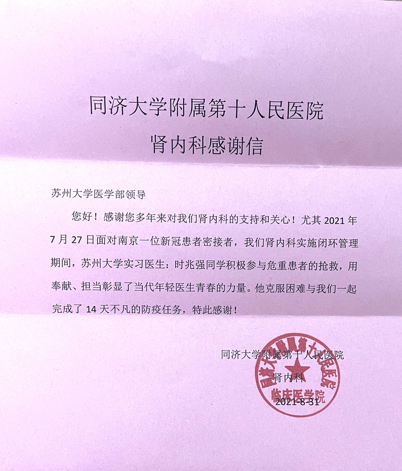 时:学弟学妹还是要好好学习理论知识,熟悉实践操作步骤,在未来的实习过程中为母校争光。我这次抗疫经历与及时处置,希望能促进在外苏大实习生更好的声誉,不要辜负母校师长的培育。
