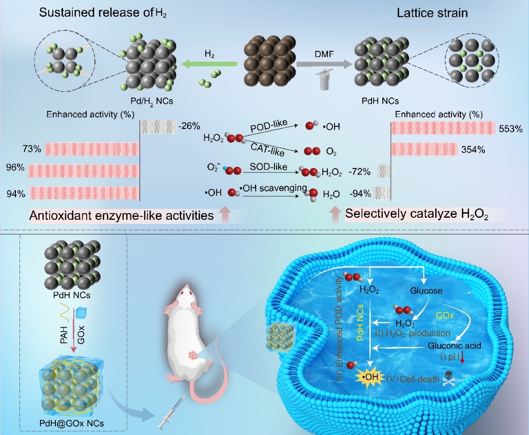 本研究以储氢钯纳米材料为研究对象,首次系统研究了氢气储存对其类生物酶活性的影响及其在肿瘤治疗中的应用。研究发现,氢储存过程不仅显著增强了钯基纳米材料的类酶活性,而且反应特异性因合成路线不同而存在显著差异:常温常压下直接向含有钯纳米颗粒的溶液中注入氢气,得到的钯氢复合物抗氧化类酶活性显著增强,有望进一步提升氢气的抗炎抗氧化效果;以DMF或水合肼为原料在高温条件下合成的氢化钯纳米材料则特异性提高了钯纳米材料对H₂O₂的催化活性,其类过氧化物酶及类过氧化氢酶活性显著提高。深入研究发现,这种高生物催化活性和反应特异性源于氢气储存过程中产生的晶格应力以及晶格氢的高化学活性。基于此,团队开发了“氢化钯/葡萄糖氧化酶纳米复合物”用于肿瘤治疗级联催化治疗,通过级联催化精准杀伤肿瘤细胞,在细胞及动物水平实现对乳腺癌的有效控制。