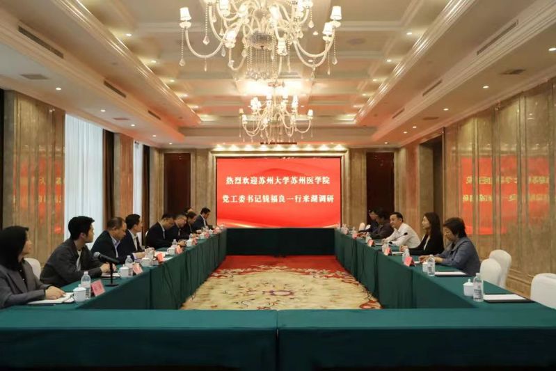 为深入学习贯彻党的二十大精神,落实党中央、国务院“稳就业”“保就业”决策部署,拓展毕业生就业渠道和就业资源,近日,苏州大学苏州医学院党工委书记钱福良,党工委副书记、副院长孟玲玲,学工办副主任施建亚,团委书记王昌伟一行赴江苏省建湖县开展“访企拓岗”活动,并与建湖主要负责人进行了恳切座谈。