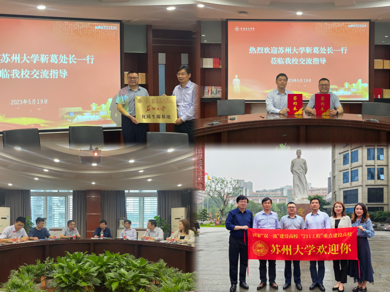 5月19日,招生宣讲团到访了重庆市巴蜀中学、重庆市第八中学、重庆市育才中学,与三校领导、年级主任和任课老师进行座谈交流,充分调研办学情况、学生培养、招宣做法等内容,并在三所中学举行了“苏州大学优秀生源基地”签约和挂牌仪式。