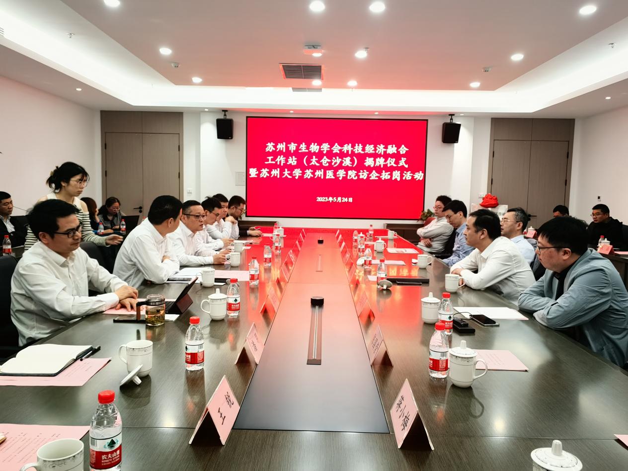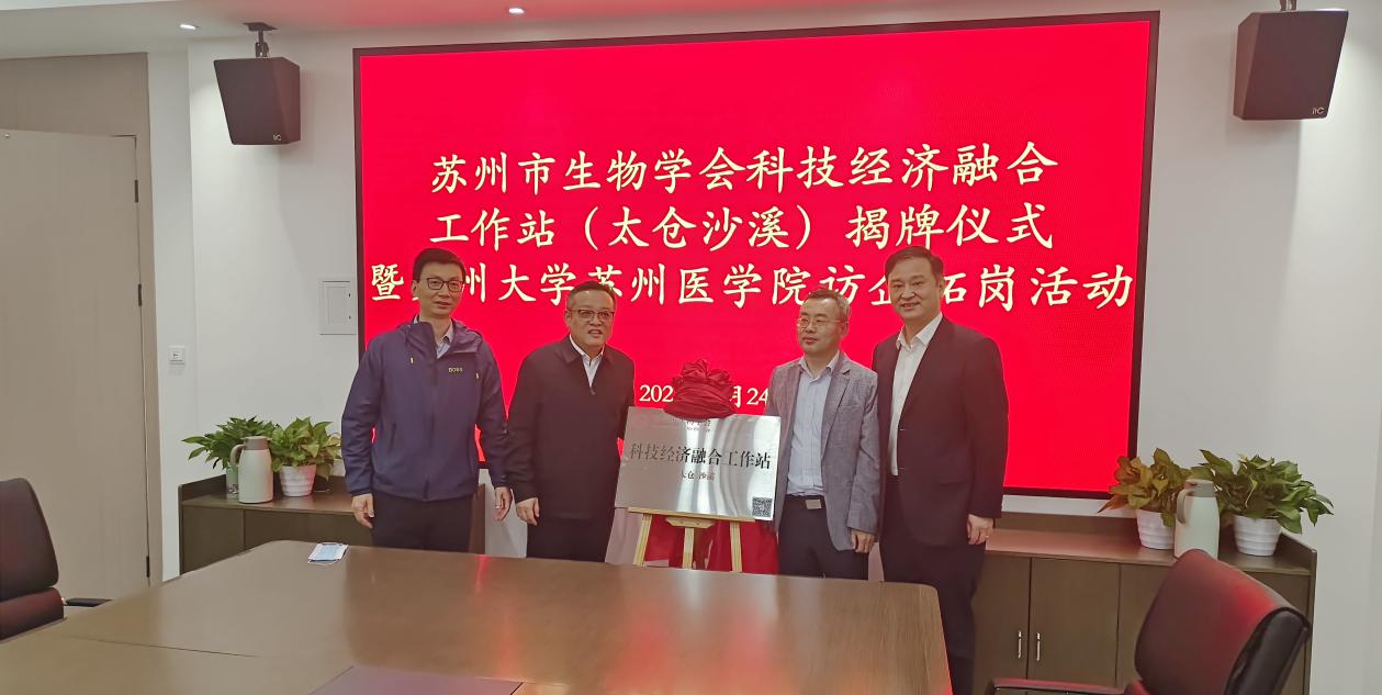 5月24日上午,苏州医学院党工委书记钱福良一行赴太仓沙溪镇太仓市生物医药产业园区出席苏州市生物学会科技经济融合工作站(太仓沙溪)揭牌仪式。与九三学社江苏省委委员、苏州市委常委、苏州大学委员会主委、苏州市生物学会理事长苏雄就生物医药科技合作举行座谈。苏州市科协副主席倪志强、太仓市科技协会主席顾技峰、苏州市生物学会秘书长戈志强、副秘书长姜智、苏州大学苏州医学院部分教授代表出席座谈会。