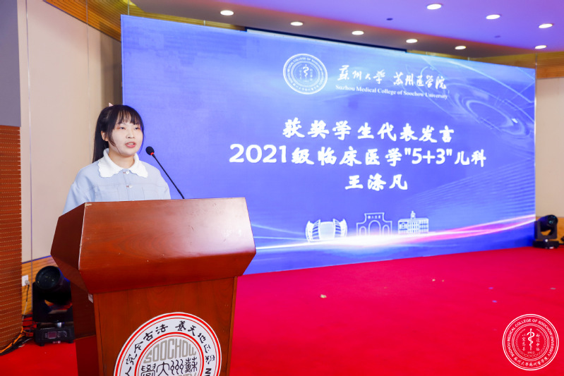 苏州大学苏州医学院2021级临床医学(“5+3”一体化,儿科医学)专业的王涤凡代表全院获奖学生对学院奖助体系给予支持的企业表示感激,对学校和学院老师的培养表达了感恩。她分享说:“这一份捐赠奖学金带给我的不仅仅是一种物质上的帮助,更重要的是一种精神财富,让我有了更大的学习动力,让我在前进的路上多了一份鞭策的力量。”