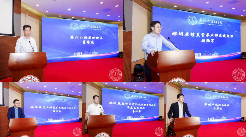 葛林虎表示回馈社会是苏州口腔医院应尽的责任,希望奖学金能够鼓励苏州医学院学子心怀医者大爱、勤奋学习、潜心研究,让青春和梦想在中华民族的伟大复兴征程上绽放芳华。顾陆军表示康哲将与苏州医学院携手,持续推动产学研合作,为医学事业发展贡献力量。阙圣法介绍了公司设立“盛发奖学金”的初衷,鼓励苏州医学院学子学有所成,为健康中国战略的实施贡献苏大医学力量。李桂鑫总结了一段时间以来康泰健与苏州医学院在科研、教学等人才培养等方面的深度融合,期联结待未来在创新等方面加强合作,为口腔医学发展培养高素质人才。王厚杰表示苏州中化与苏州医学院学子有深厚的渊源,希望苏州中化未来能够凝聚更多的力量,为苏州大学和苏州医学院的发展做出更多的贡献。
