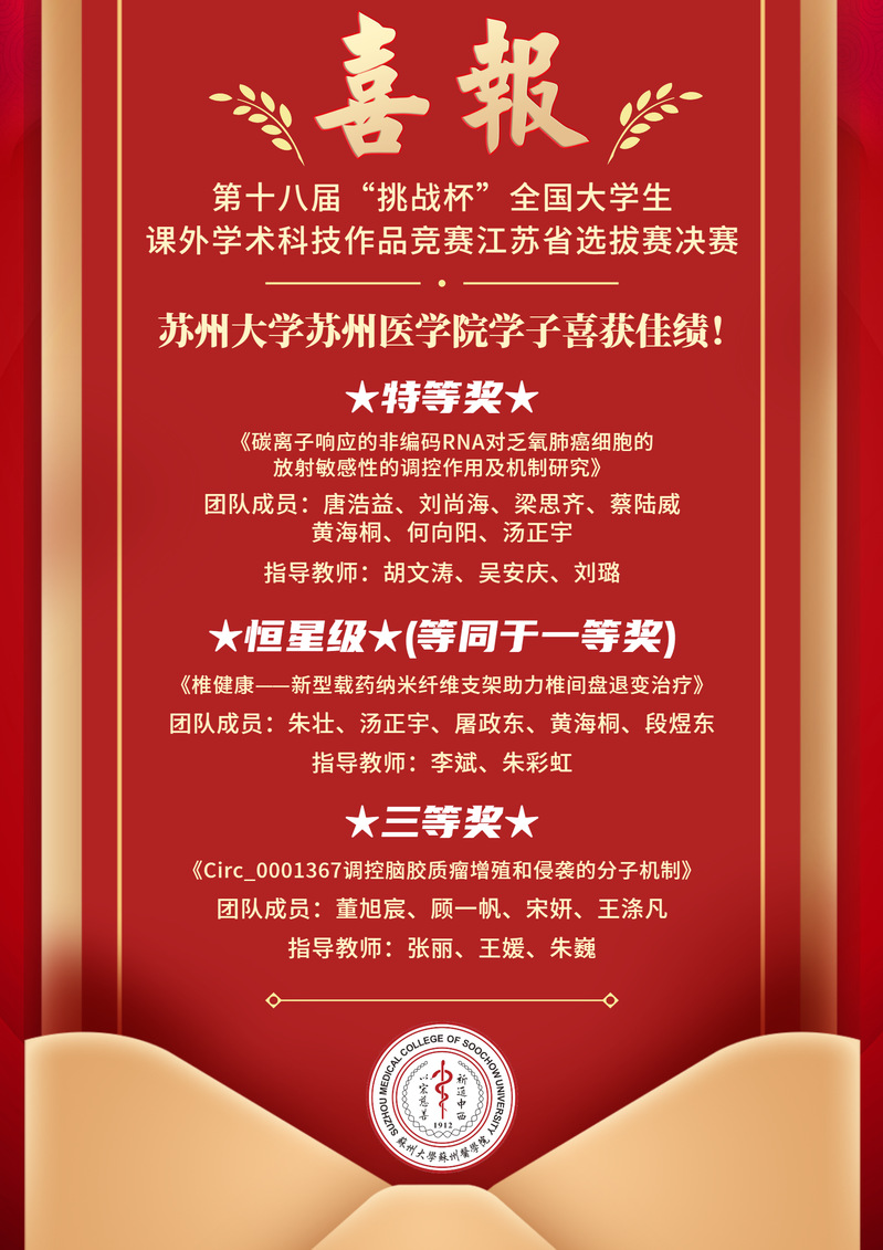 第十八届“挑战杯”全国大学生课外学术科技作品竞赛江苏省选拔赛苏州大学苏州医学院学子喜获佳绩