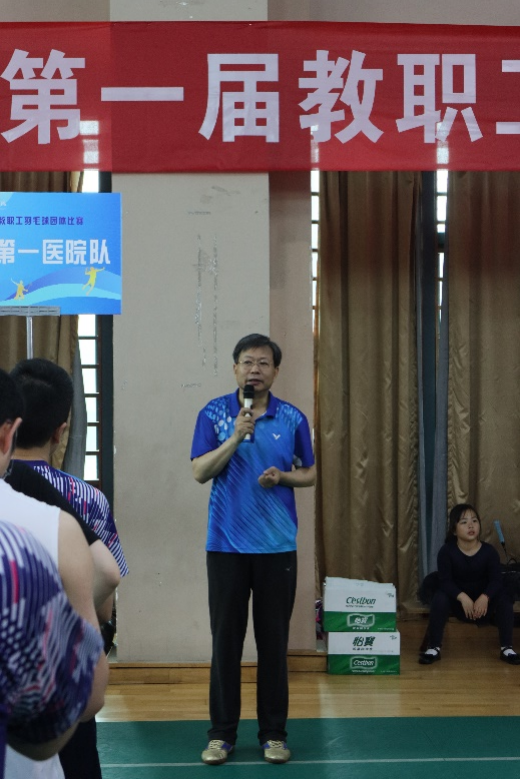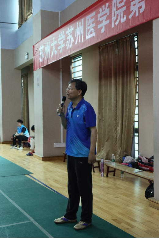 上午8点30分,比赛活动开始。唐仲英医学研究院党委书记、苏州医学院工会执行主席芮秀文受苏州医学院党政领导的委托,热情洋溢地为本次活动致开幕词。他首先祝贺苏州医学院临床医学、药理学与毒理学两个学科新晋ESI全球排名前1‰,充分展现苏州医学院各项事业蓬勃发展态势。同时强调,在实施健康中国战略征程中,苏州医学院第一届教职工羽毛球赛的顺利举办具有重要意义,不仅为广大教职工群体提供了一个交流的平台,加强医学院各学院、科研机构与各附属医院的紧密联系,并进一步丰富了大家的业余生活,提升我院教职员工身体素质。希望通过本次比赛,增强苏州医学院各学院、科研机构、附属医院之间凝聚力,大家“以球会友”,赛出友谊、赛出风格、赛出水平。最后,芮秀文宣布苏州大学苏州医学院第一届教职工羽毛球团体比赛正式开始。