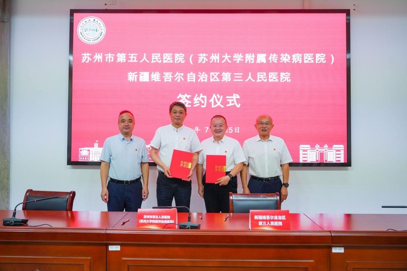 随后,苏州市第五人民医院(苏州大学附属传染病医院)与新疆维吾尔自治区第三人民医院进行签约仪式,签署了合作协议。苏州市第五人民医院(苏州大学附属传染病医院)院长张钧与新疆维吾尔自治区第三人民医院院长杨成新表示,双方将通过专科共建、教育培训协同合作、科研项目协作等多种方式,双向促进职业病相关学科医疗服务能力和管理水平,在未来的建设与发展中,形成良好的互助共进关系。