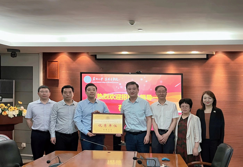 靳葛充分肯定了苏州医学院过去一年在招就工作中取得的成绩,并为学院颁发2022年本科招生宣传优秀单位牌匾。