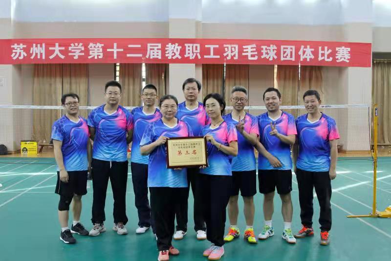 2021年11月13日上午,在学校第十二届教职工羽毛球团体比赛决赛中,经过激烈角逐,我院分工会荣获团体赛第三名。本次比赛,由学校工会主办、教工羽毛球协会承办,共有31支队伍参加,“四方共建”后苏州医学院分工会第一次在学校教职工体育比赛中亮相,赛出了友谊,赛出了水平。