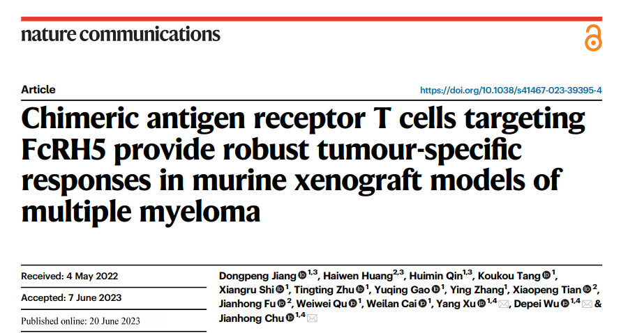 2023年6月,国家血液系统疾病临床医学研究中心、苏州大学附属第一医院、造血干细胞移植研究所的吴德沛、徐杨、储剑虹教授团队在Nature Communications期刊上在线发表了题为“Chimeric antigen receptor T cells targeting FcRH5 provide robust tumour-specific responses in murine xenograft models of multiple myeloma”的研究论文,报道了靶向FcRH5的CAR-T细胞在体外和小鼠异种移植模型中具有强力的清除多发性骨髓瘤(MM)细胞的能力,揭示FcRH5可作为CAR-T疗法治疗复发难治性MM的全新靶点。