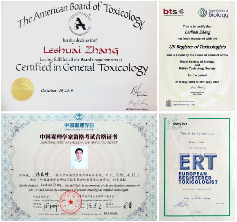 2018年,张乐帅获得了欧洲/英国毒理学家的注册资质。欧洲注册毒理学家(EUROTOX Registered Toxicologist,ERT)是经由皇家生物协会(Royal Society of Biology)授予英国注册毒理学家(UK Registered Toxicologist,UKRT)自动获得的勋衔。ERT是张乐帅在毒理学职业规划及生涯中重要的里程碑,其获得需要具备诸如DABT资质、至少五年的毒理学执业经验,以及数名毒理学人士(至少一名为ERT)的推荐。获得ERT后,每五年需重新注册,需同时在学术与工业界的毒理学领域中积极活动方可保持其身份。