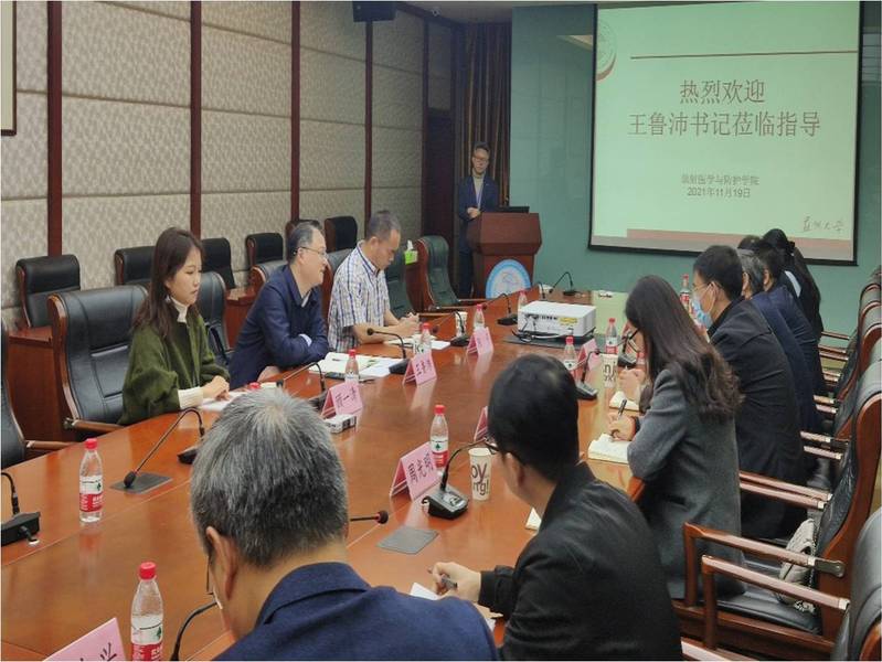 2021年11月19日,校党委副书记王鲁沛、学生工作部(处)副部(处)长陈平、学生资助管理中心(学生劳动教育指导中心)顾一清一行莅临放射医学与防护学院调研指导本科生陪伴计划工作。医学部党工委副书记黎春虹、放射医学与防护学院院委书记王成奎、常务副院长曹建平、副院长周光明等在401楼一楼会议室参加调研座谈。