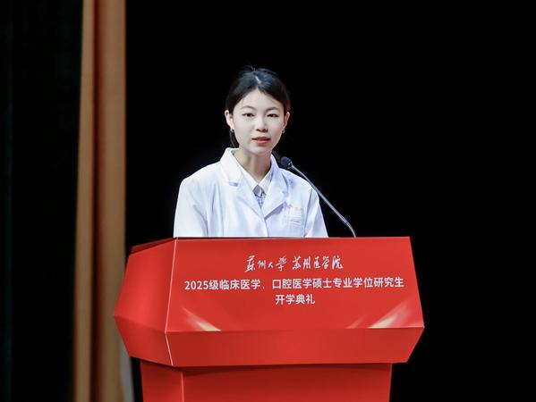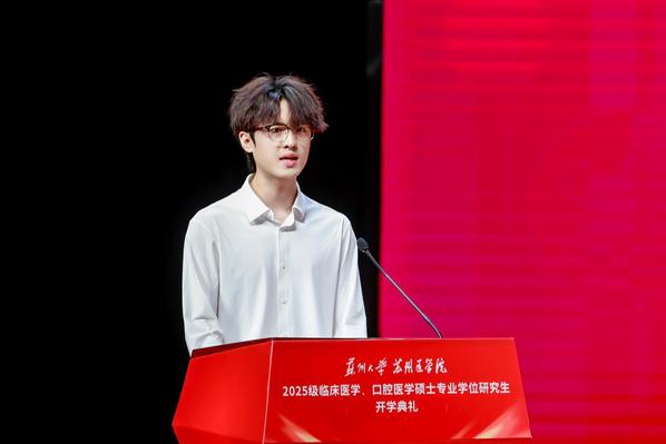 老生代表、2024级神经病学专业高燕春同学与大家分享了三个关键词:蜕变、平衡、温度。她认为,医学的旅程不会轻松,但绝对值得,大家会在这里收获过硬的本领、深厚的友谊,甚至一生的职业方向。她希望学弟学妹们既能脚踏实地完成每一项任务,也能仰望星空怀揣医学理想,以实际行动践行“健康所系,性命相托”的医学誓言。