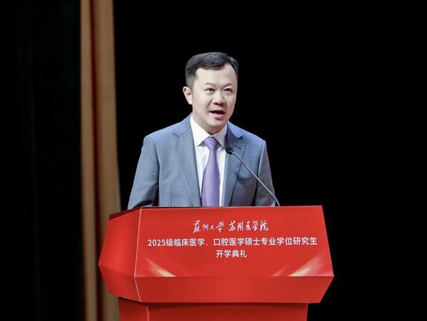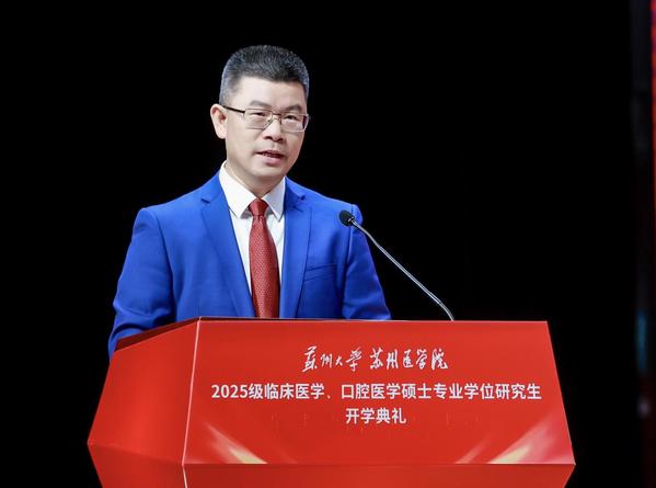 苏州医学院执行院长李斌介绍了苏州医学院的发展历史,“四方共建”以来苏州医学院在师资队伍、学科建设、人才培养方面的情况。他对大家提了三点期望:做“求真致知” 的追光者:以严谨之心探医学奥秘;做“心怀仁术” 的守护者:以温度之力传医学大爱;做“勇担使命” 的开拓者:以家国之心筑健康中国。他期待,所有新生能够以仁爱之心关怀患者,以严谨之学追求真理,在苏州医学院这片医学的沃土上,开启一段探索生命奥秘、践行医者仁心的旅程。