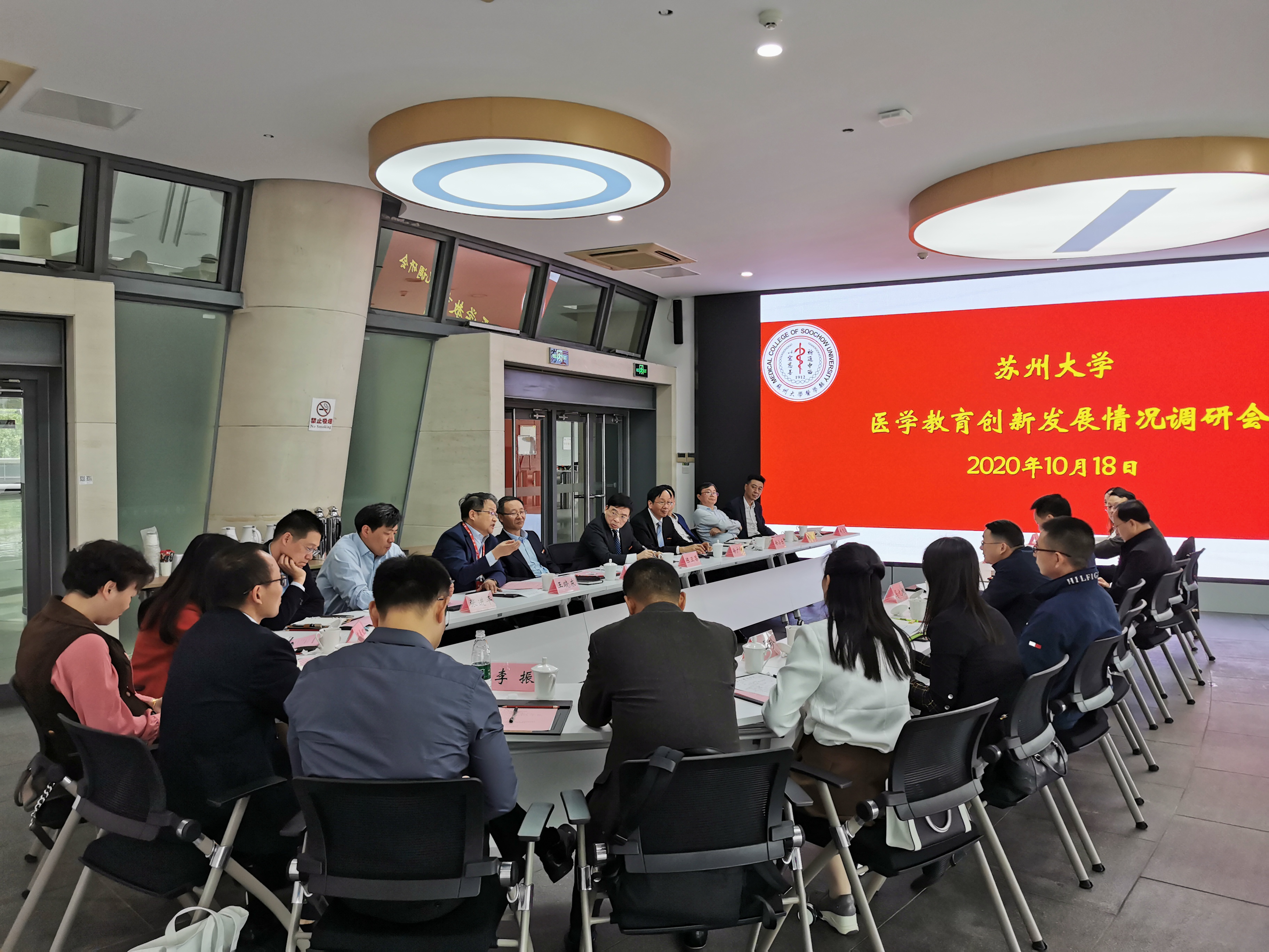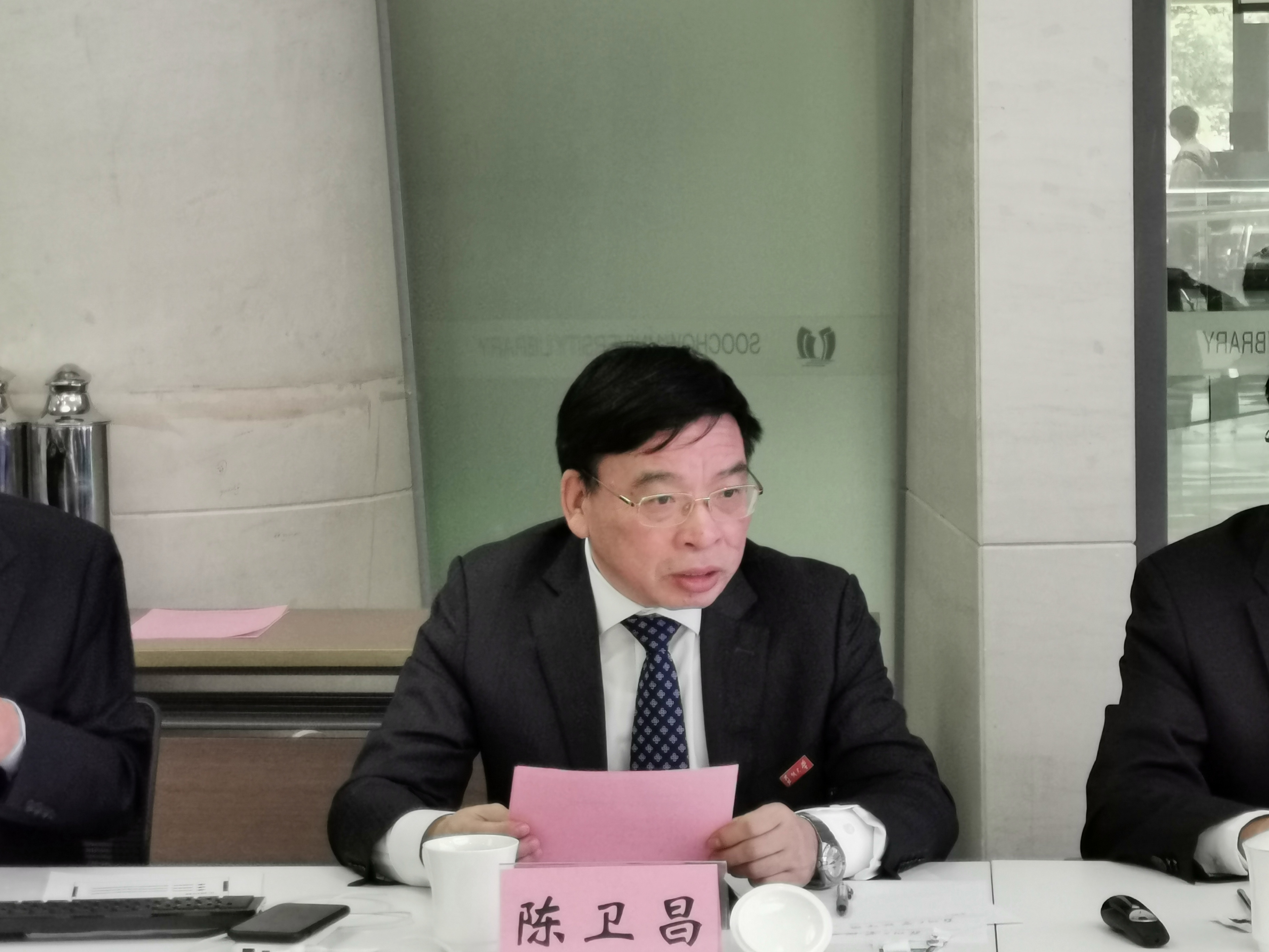 10月18日,正值苏州大学迎来建校120周年之际,江苏省政府办公厅副主任邹宁华一行赴我校调研。苏州市政府副秘书长马九根,苏州市教育局正处职干部高国华,校党委常委、副校长陈卫昌陪同调研,并在独墅湖校区炳麟图书馆召开苏州大学医学教育创新发展情况调研会。会议由陈卫昌副校长主持。