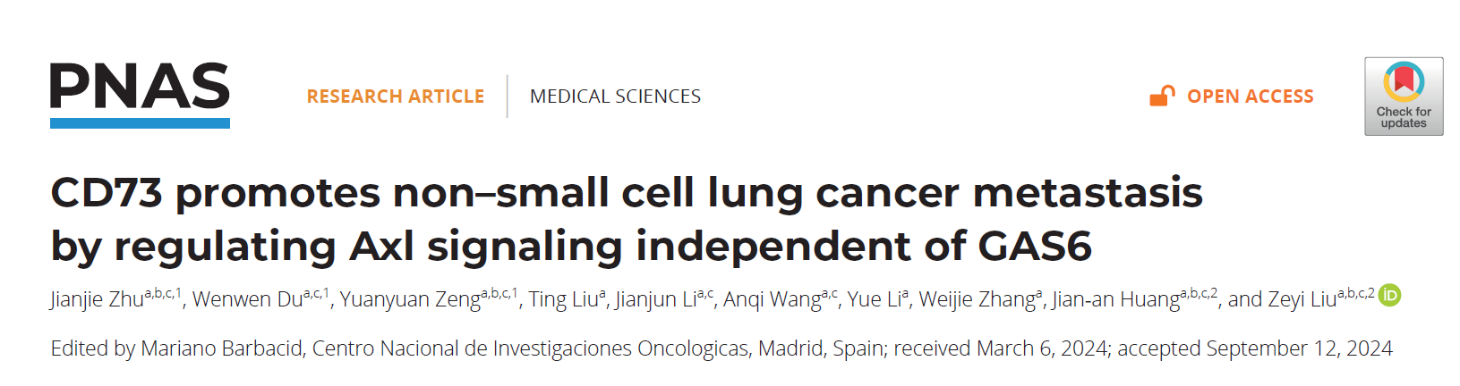 此外,该团队前期于PNAS期刊上发表的另一项研究,系统阐释了CD73作为新型配体直接激活Axl/Smad3信号通路、促进非小细胞肺癌转移的非经典机制。这项研究不仅揭示CD73与Axl在肺癌组织中的表达呈正相关,还发现其作用方式在肺腺癌和肺鳞癌中存在差异,强调了靶向CD73在抑制肺癌转移中的潜在价值。