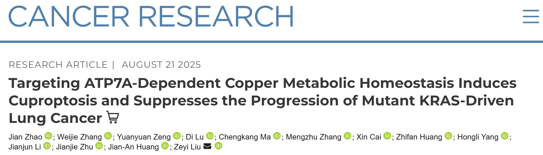 近期,该团队于国际知名期刊Cancer Research(IF = 16.6)上发表题为“Targeting ATP7A-Dependent Copper Metabolic Homeostasis Induces Cuproptosis and Suppresses the Progression of Mutant KRAS-Driven Lung Cancer”的重要论文。该研究首次揭示了铜离子载体Elesclomol(ES)可通过诱导内质网应激-OSTM1轴,促进铜转运蛋白ATP7A的泛素化降解,破坏KRAS突变型肺腺癌细胞的铜代谢稳态,进而诱发铜死亡(Cuproptosis),显著抑制肿瘤进展。这一发现为长期以来缺乏有效靶向治疗方案的KRAS突变肺癌患者提供了全新的治疗思路和实验依据,具有重要的临床转化前景。