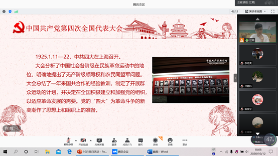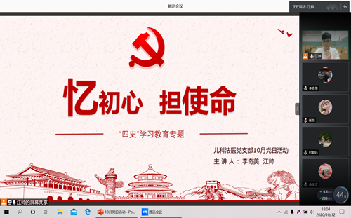 为进一步贯彻开展“四史”学习教育活动的通知精神,让学习落到实处,促进知行合一、学史明志,医学部儿科法医党支部于2020年10月12日下午18:00通过腾讯会议线上举办了“忆初心,担使命——‘四史’学习教育专题”党日活动。参会的党员包括支部书记解笑、组织委员张恬、纪检委员林野以及医学部儿科法医党支部全体党员。
