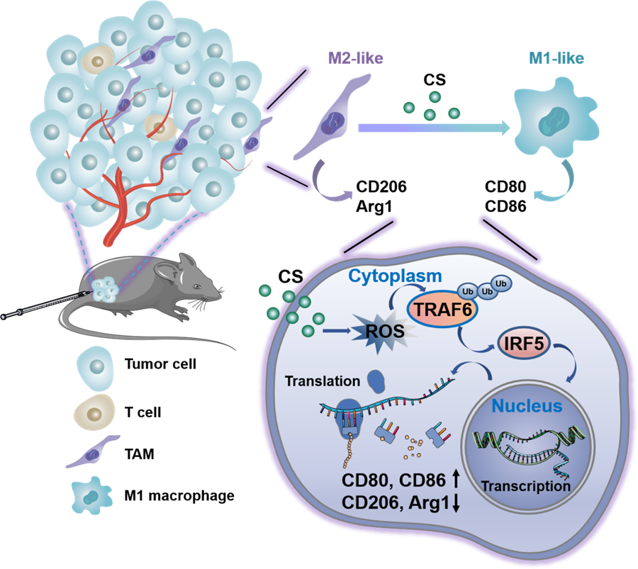 调节抑制性肿瘤免疫微环境(TIME)重建免疫监测系统是非常有前景的肿瘤免疫疗法。实体瘤中存在较为丰富的肿瘤相关巨噬细胞(TAMs),通常表现为促进肿瘤生长的M2型巨噬细胞,对肿瘤生长、转移、侵袭发挥着重要作用。此外,它们还通过降低T细胞的活性抑制适应性免疫。相反地,M1型巨噬细胞具有较强的肿瘤杀伤和抗原提呈能力,可通过激活抗肿瘤T细胞反应而增强抗肿瘤效果。因此,将TAMs从免疫抑制性的M2表型极化为抑制肿瘤生长的M1表型是抗肿瘤免疫治疗的重要策略。然而,利用无机纳米颗粒的固有性质调控TAMs表型鲜有报道,其调控作用机制尚不明确。