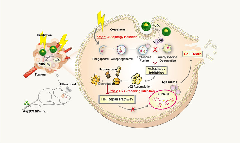 图1. Au@Cu2-xSe纳米颗粒抑制肿瘤细胞自噬流、阻碍DNA损伤修复及提高放疗敏感性的示意图