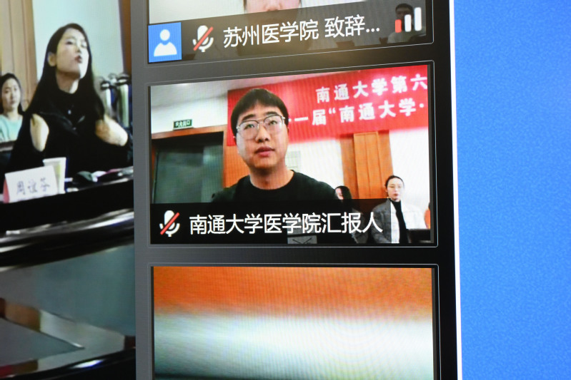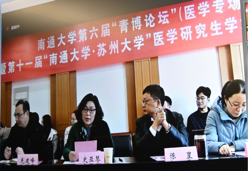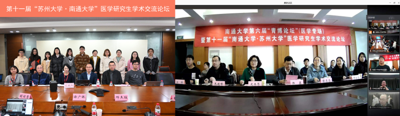 本届苏通论坛应疫情防控形势要求,创新采用线上与线下结合的方式。论坛也得到苏州大学苏州医学院、南通大学医学院相关领导的大力支持,参与论坛嘉宾有南通大学医学院党委书记史亚琴、副院长陈罡、科研与研究生管理办公室主任羌建峰、副主任彭亮亮、研究生辅导员周谊芬、李惠子;苏州大学苏州医学院常务副院长徐广银、党工委副书记吴德建、研究生辅导员邓杰琼、舒鹏。论坛由吴德建主持。论坛评审由苏州医学院王雪峰、胡丽芳、董晨三位教授担任,南通大学医学院研究生陈褚、李雯、朱斌、马硕,苏州大学苏州医学院研究生沈俊杰、王晓卉、董兴璇、郑艳会等八位同学作为双方代表参与论坛汇报。
