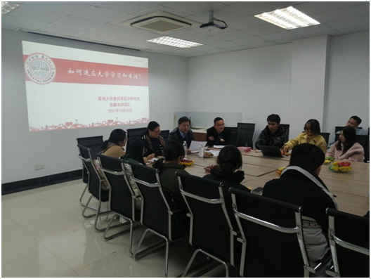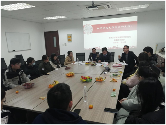 12月15日下午,苏州大学立德树人之本科生成长陪伴计划-唐仲英医学研究院芮秀文、徐鹏导师导生团队在苏州大学独墅湖校区开展了师生交流座谈会。会议主题为“如何适应大学学习和生活”,由唐仲英医学研究院立德树人之本科生成长陪伴计划专业导师--徐鹏教授主持。导师团队德政导师唐仲英医学研究院党委芮秀文书记,苏州医学院学生工作办公室副主任孙静老师、蔡莉老师,团队导生以及团队成员2021级临床医学五班15位学生参加了此次座谈会。