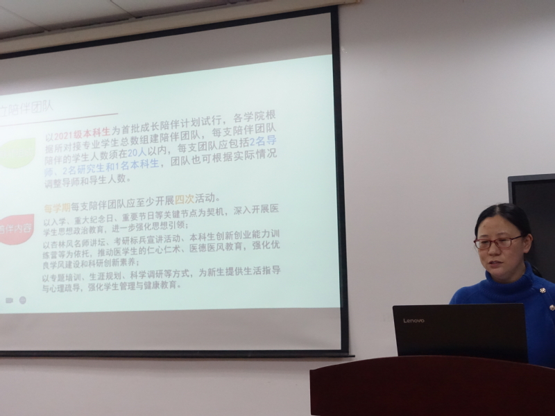 孙静首先从实施背景、总体思路、实施内容等方面全面介绍了本科生成长陪伴计划。张洁也向与会人员介绍了学院本科生成长陪伴计划实施的基本情况并对未来的工作设想进行了说明。