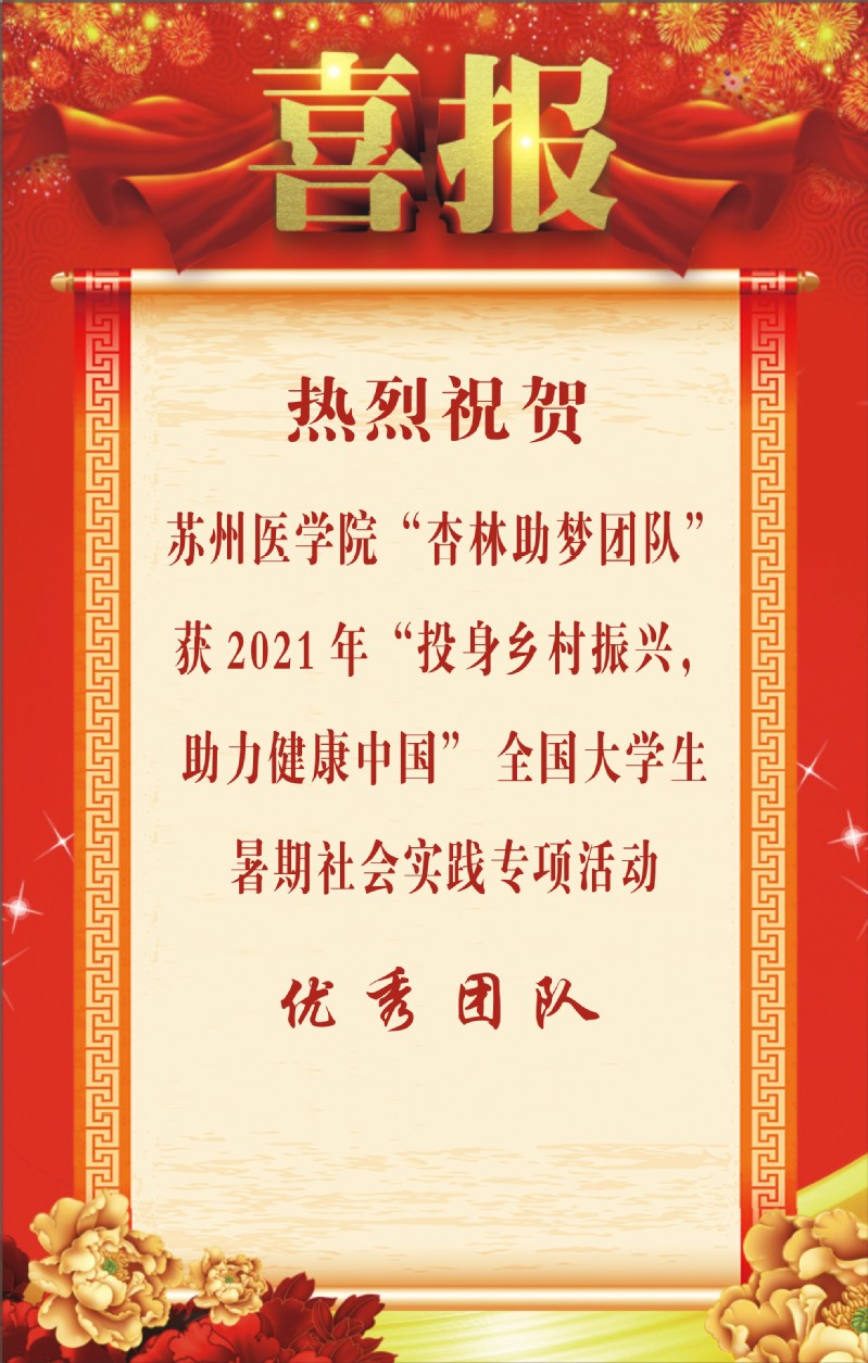 喜报:苏州医学院“杏林助梦团队”获2021年全国大学生暑期社会实践专项活动优秀团队荣誉