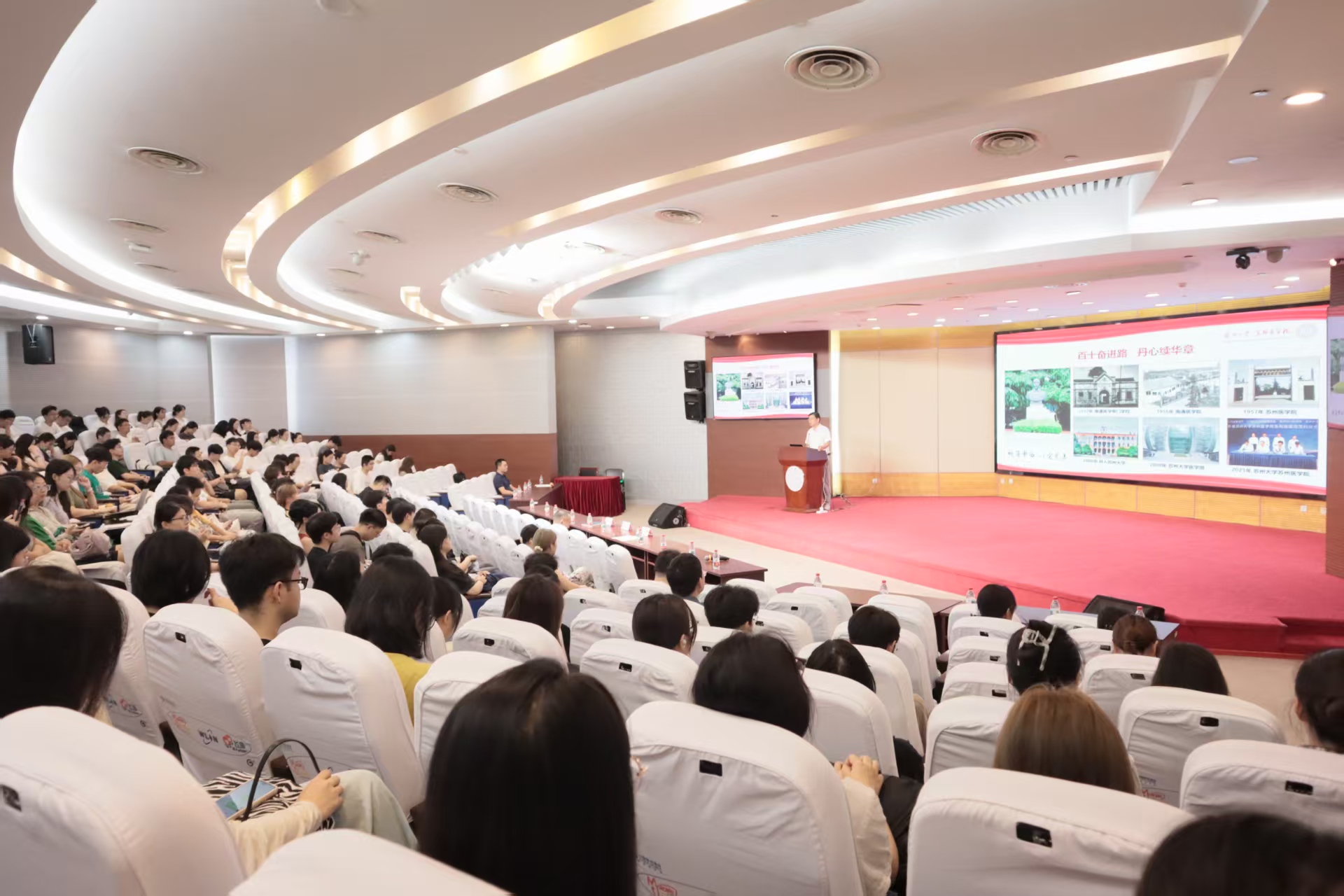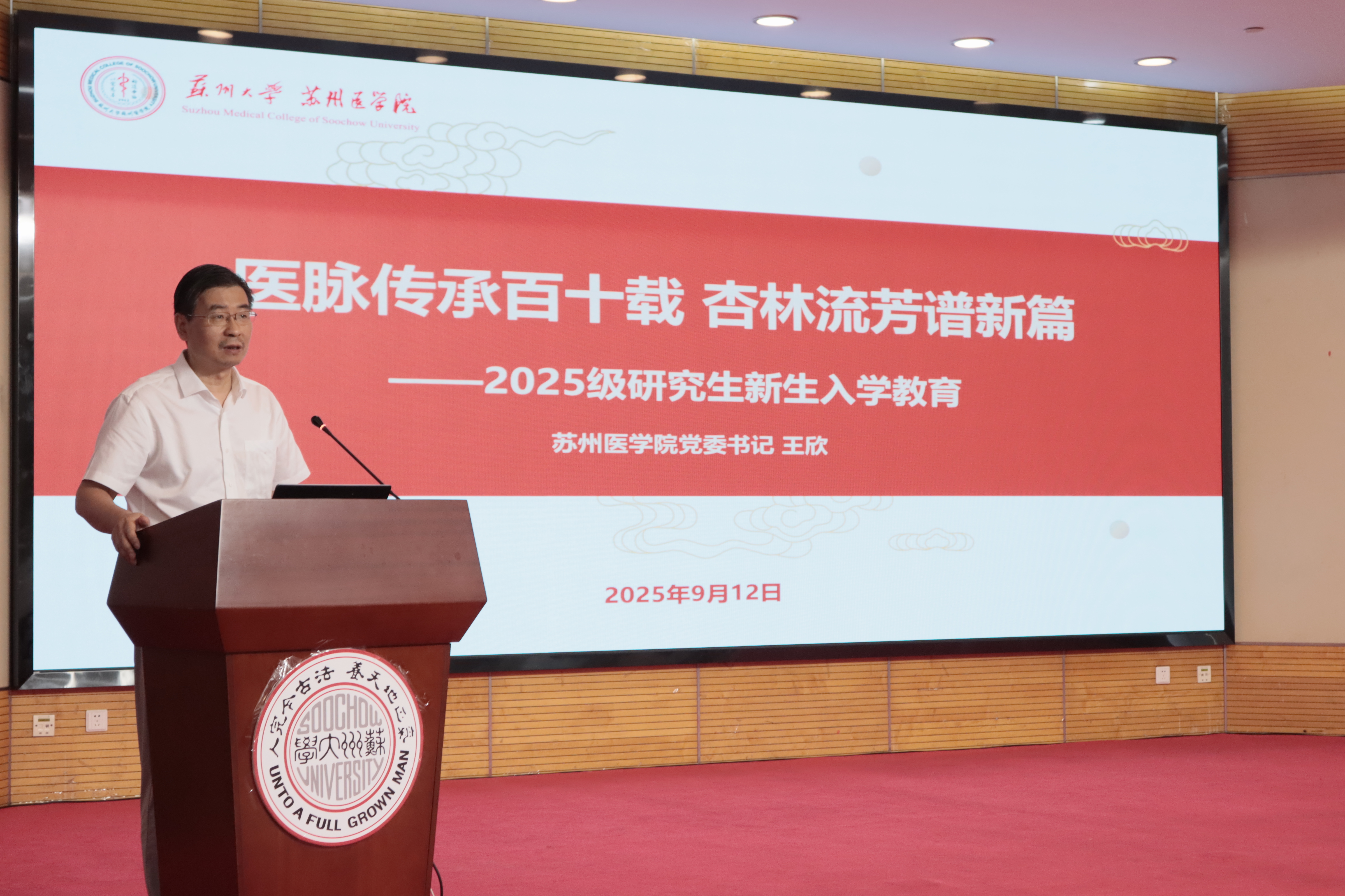 立德树人、培才报国。在入学教育专题讲座中,苏州医学院党委书记王欣老师以《医脉传承百十载 杏林流芳谱新篇》为题作报告。他以深厚的情怀和宽广的视野,带领新生们回望苏州医学院的发展历程,梳理学院在学科建设、人才培养、医学贡献等方面取得的重要成就,并结合学院的发展理念与未来目标,为同学们描绘了医学教育的宏伟蓝图。王欣老师强调苏州医学院始终坚守“祈通中西,以宏慈善”的院训,培育了一批又一批卓越医学人才,其中包括以詹启敏院士为代表的杰出校友。他勉励2025级新同学以医学大家和优秀前辈为榜样,厚植家国情怀,树立远大志向,勤学笃行,不断在科研与实践中磨砺成长,为健康中国建设和民族复兴伟业贡献青春与智慧。