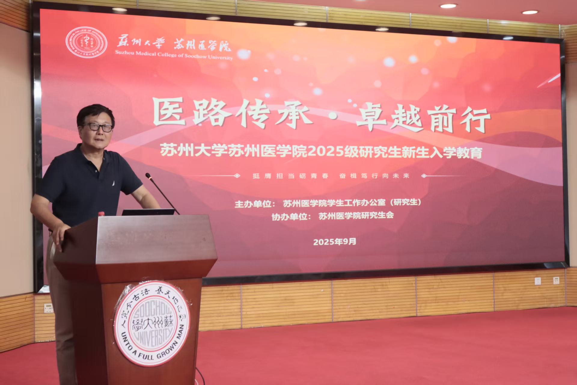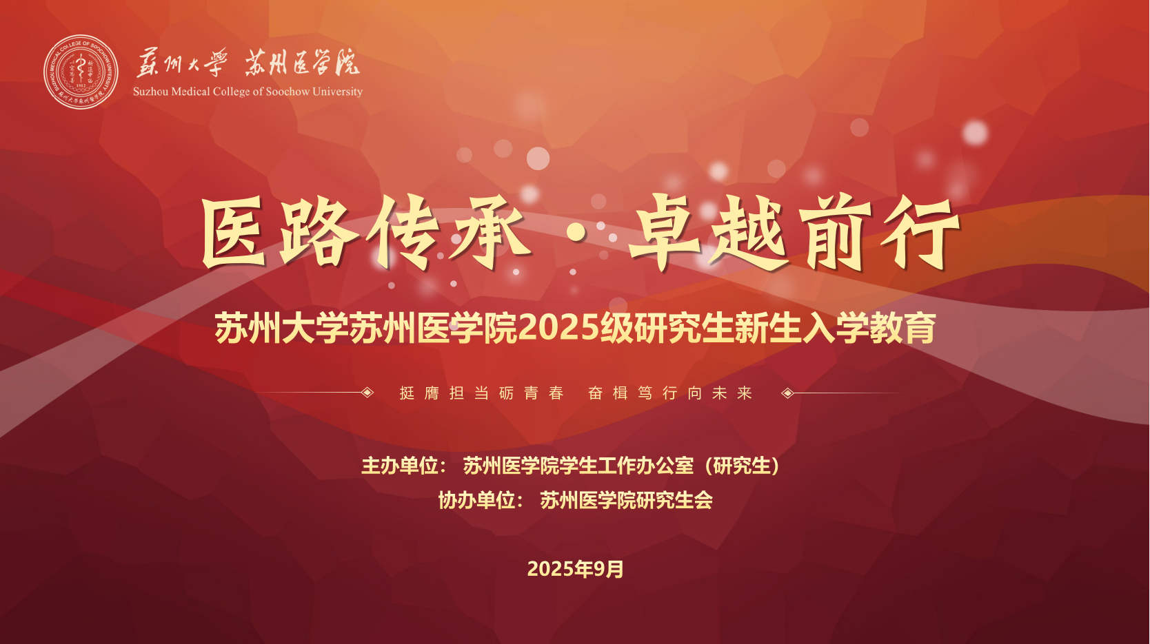 为引导研究生坚定理想信念、端正学习态度、明确发展目标、快速融入新环境,苏州医学院根据《苏州大学研究生时代新人“铸魂·卓越”工程实施方案》和《关于开展2025级研究生新生入学教育的通知》总体要求,系统谋划并高质量推进了2025级研究生新生入学教育系列活动。本次活动以“医路传承·卓越前行——培育卓越医学人才,服务健康中国建设”为主题,构建起“学校-苏州医学院-研究生培养单位”三级联动的育人格局,覆盖全体1932名2025级研究生。活动旨在通过“理想信念、爱校荣校、科技创新、心理健康、日常管理”五大板块,全方面引导新生赓续医学薪火、涵养家国情怀、树立远大志向,全面提升科学素养与创新能力,助力其在新时代医学事业与健康中国战略中实现高质量成长与发展。