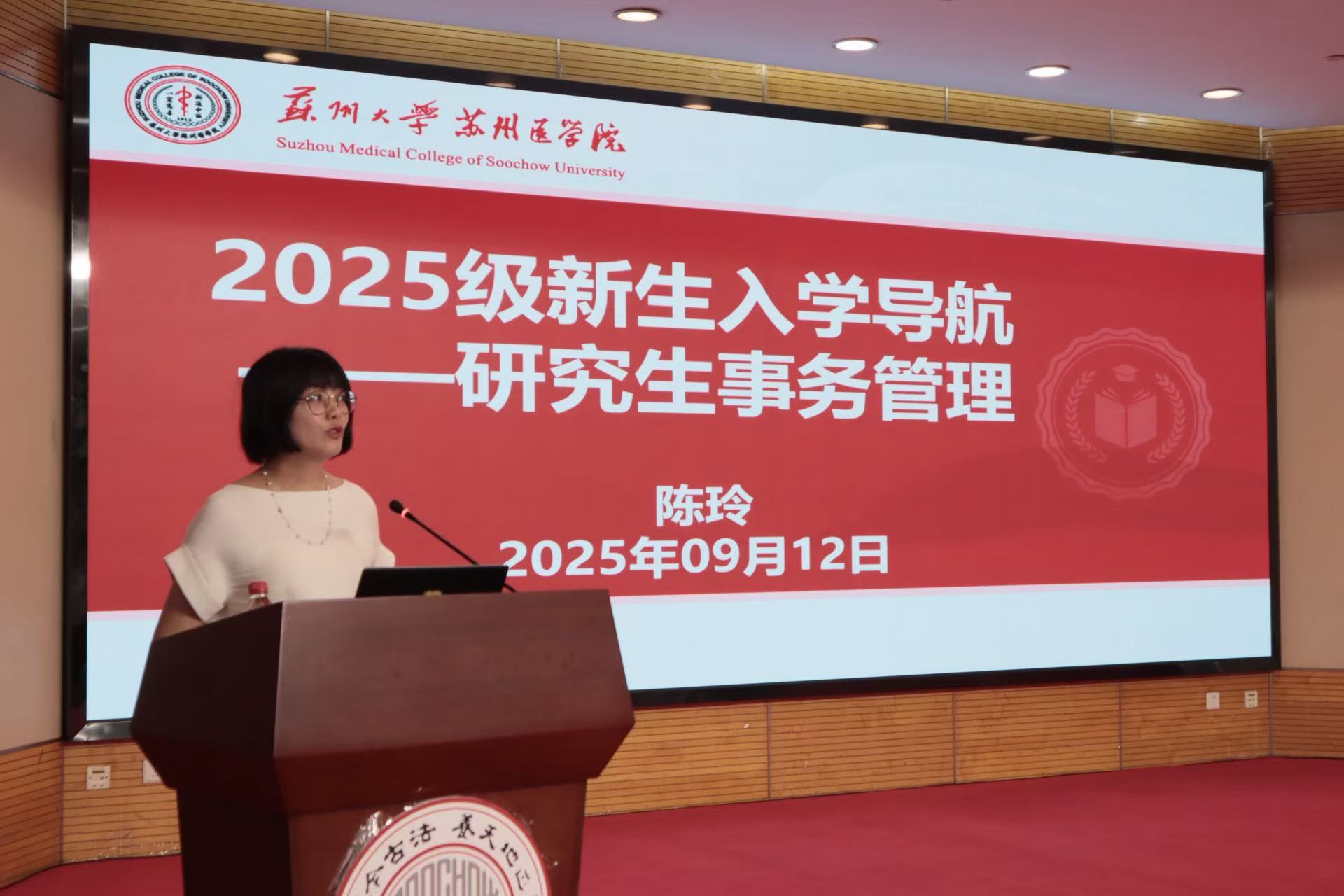 其中,理想信念教育活动于9月16日在独墅湖体育中心举行的2025级新生开学典礼上同步开展;其他主题教育活动于9月12日在独墅湖校区炳麟图书馆一楼学术报告厅举办,活动由苏州医学院学生工作办公室(研究生)、苏州医学院研究生会协办,舒鹏老师主持,2025级苏州医学院研究生通过线上、线下相结合的方式参会。