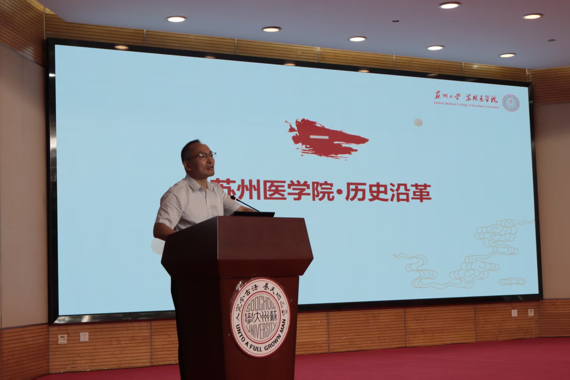 苏州医学院党委副书记吴德建老师围绕学院院史进行了补充讲述。他希望同学们能够从学院厚重的发展历史中汲取精神力量,增强对苏州医学院的认同感与使命感,在新的人生阶段中尽快适应环境、融入集体,坚定理想信念,开启逐梦新征程。