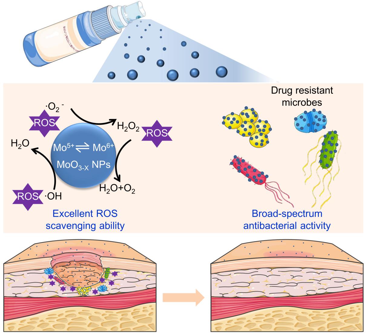 在该研究中,高明远教授课题组通过简单的一锅反应法,制备了一种兼具良好ROS清除与抗菌活性的超小的氧空位氧化钼(MoO3-X)纳米点。该材料对超氧阴离子、羟自由基与过氧化氢等ROS均表现出了良好的清除效果。此外,通过大量的细菌实验证实MoO3-X纳米点可破坏细菌的细胞壁,且对耐药菌亦展现出广谱的杀菌性能。动物实验进一步证实MoO3-X纳米点可有效降低糖尿病创面的ROS,杀死感染的甲氧西林耐药的金黄色葡萄球菌,显著加速了创面愈合。值得注意的是,MoO3-X纳米点,成分单一,制备简单,更利于其临床转化。