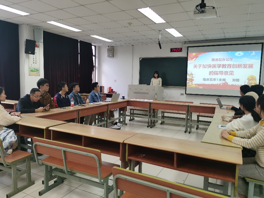首先,由支部书记刘璐老师以学习《国务院办公厅关于加快医学教育创新发展的指导意见》为主题分享党课。党课上,刘璐老师围绕“总体要求”、“全面优化医学人才培养结构”、“全力提升院校医学人才培养质量”、“深化住院医师培训和继续医学教育改革”、“完善保障措施”五个方面展开讲解,勉励在座的医学生党员牢记“健康所系,性命相托”的医学生誓言,树立“家国一体”观念,勇担“健康中国”建设使命,成为有理想、有情怀、有担当的苏医学子。