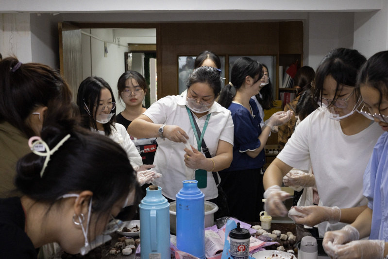 接下来的月饼制作过程也是精彩纷呈,节日气氛浓厚。在老师的指导下,同学们兴致盎然地制作自己的专属月饼,搓面团、包馅料、压模印,有条不紊地进行着,很快形式各样的月饼便在巧手中诞生。师生欢聚一堂,共话幸福团圆。