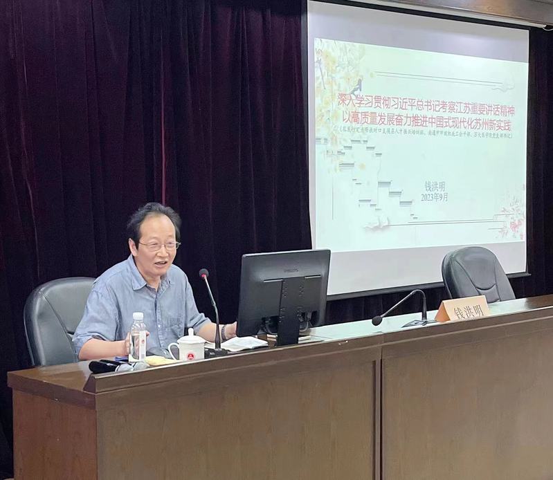 9月28日上午,苏州市委研究室原副主任钱洪明就深入学习贯彻习近平总书记考察江苏重要讲话精神,以高质量发展奋力推进中国式现代化的苏州新实践展开专题教学。钱洪明主任指出,高质量发展涉及全领域、覆盖全地域、贯穿全过程;并从推动高质量发展的苏州意义、苏州目标和苏州实践三个方面介绍了苏州发展现状及发展前景与方向。