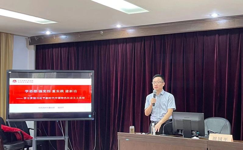 9月27日上午,苏州市委党校周国平教授作第一场专题讲座,就深入学习贯彻习近平新时代中国特色社会主义思想和党的二十大精神展开“学思想、强党性、重实践、建新功”专题教学。周国平教授讲到,广大党员同志要不断增强四个认同,不断深入学思践悟;坚定捍卫“两个确立”,坚决做到“两个维护”;牢牢把握习近平新时代中国特色社会主义思想的主题主线、思想体系及精髓要义。