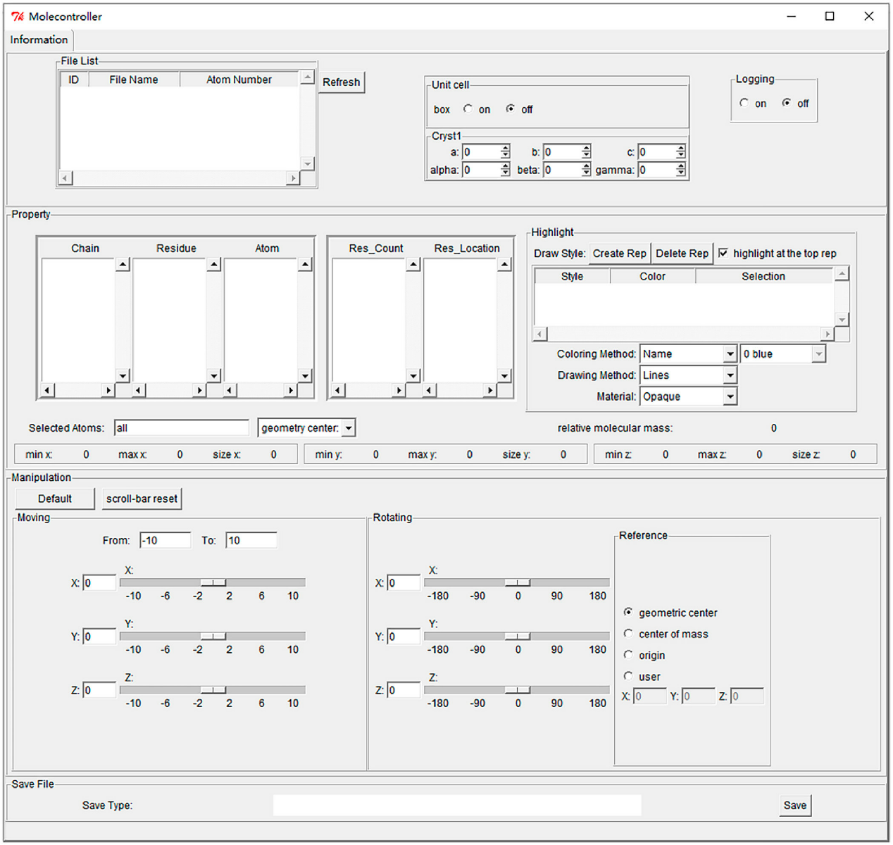 Molcontroller-GUI使用开发的Tcl/Tk工具包,并可以集成到Extensions/Modeling/Molcontroller VMD。Molcontroller-GUI包含几个功能框,例如Information,Property,Manipulation和Save File。主要功能描述如下: