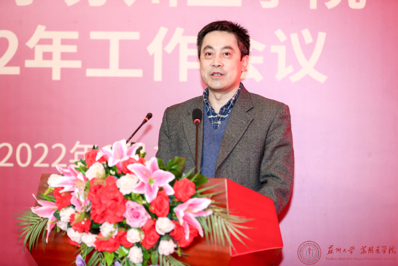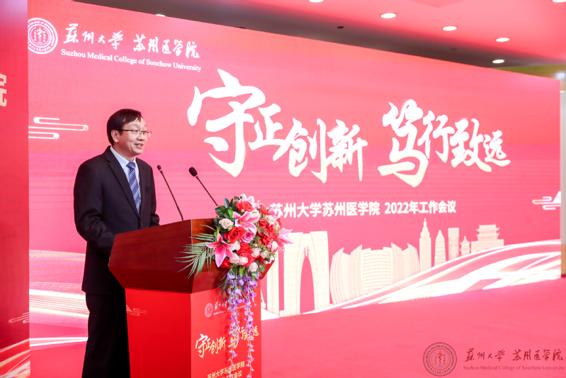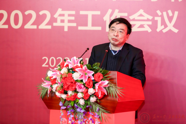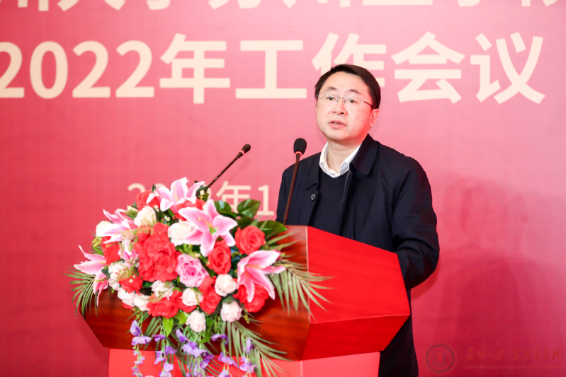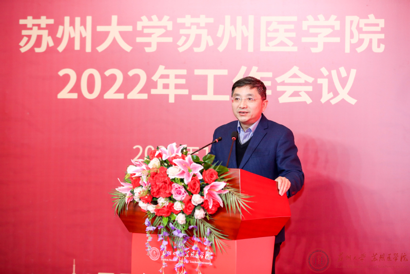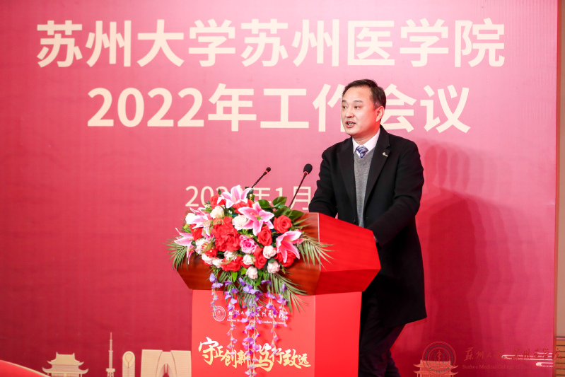 江涌书记在致辞中指出,此次工作会议是苏州医学院的“新年第一会”,也是一次凝聚共识、统一思想、共谋发展的战略研讨会,对于提炼和总结宝贵经验,形成发展策略和具体工作方案具有重要的指导性和示范性意义。他强调,省市两级政府立足全局战略,大力支持苏州医学院及附属医院的发展,苏州医学院当前正面临难得的历史发展机遇,苏州市委市政府更是将苏州大学苏州医学院及附属医院的改革发展纳入全市总体规划,学校党委和行政始终高度重视苏州医学院及附属医院发展。希望在各方共同努力下,推动苏州医学院早日进入国内医学院校第一方阵,为苏大医学教育110周年献礼,并以优异的成绩喜迎党的二十大召开。