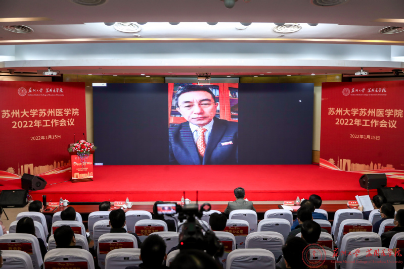 1月15日,苏州大学苏州医学院2022年工作会议在独墅湖校区炳麟图书馆学术报告厅召开。本次会议采用线上线下相结合的形式举行,江苏省卫生健康委员会副主任张金宏,苏州市政府副秘书长马九根,我校党委书记江涌,党委常委、副校长陈卫昌,中国工程院院士、苏州医学院院长詹启敏,中国科学院院士王志新,欧洲科学院院士时玉舫,以及学校各职能部门负责人,苏州医学院及附属医院各单位党政、科研机构主要负责人出席会议。我校校长熊思东、中国科学院院士柴之芳,苏州医学院市级以上党代表、人大代表、政协委员、各民主党派主要负责人,苏州医学院及附属医院各单位负责人,以及苏州医学院师生代表线上参会。会议由苏州医学院常务副院长徐广银主持。