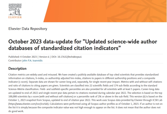 2023年10月,美国斯坦福大学发布了2023年度“全球前2%顶尖科学家榜单”,该榜单包括“终身科学影响力排行榜”和“2022年度科学影响力排行榜”两个榜单。