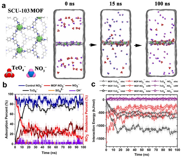 分子动力学模拟进一步解释了吸附机理:首先,与NO3−、SO42−、OH−等阴离子相比,99TcO4−与SCU-103之间结合能力较强,随着吸附时间的延长,99TcO4−逐渐取代SCU-103中NO3−的结合位点进入到阳离子骨架中,而被吸附的SO42−、OH−非常少。另一方面,由于99TcO4−和NO3−之间的静电排斥作用,进入到骨架中的99TcO4−会削弱了SCU-103和NO3−之间的相互作用,促使NO3−从骨架中解离。本工作不仅在高稳定的阳离子型MOFs材料的合成上取得了突破,而且首次报道了将阳离子MOFs材料应用于治理真实放射性废液体系,表明了阳离子MOFs材料在放射性阴离子污染去除方面潜在的应用前景。相关结果已正式发表在Nature Communications上(Nat. Commun., 2020, 11, 5571)。