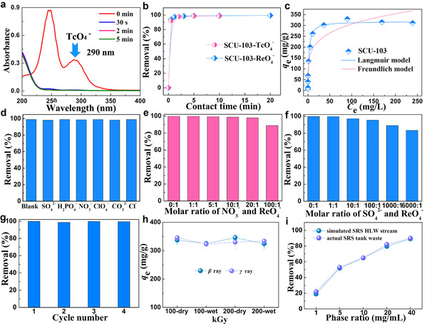 图2 (a-b) SCU-103的吸附动力学; (c) Langmuir吸附容量等温线; (e-f) SCU-103的选择性吸附实验; (g) 循环利用实验; (h) 辐照稳定性测试; (i) SCU-103在真实和模拟萨瓦纳河废液中的99TcO4−去除率.