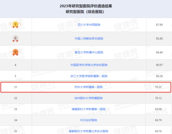 本次评选中,苏州大学附属第一医院荣列研究型综合医院排行榜第31位,苏州大学附属第二医院、苏州大学附属儿童医院获评研究型医院建设单位。