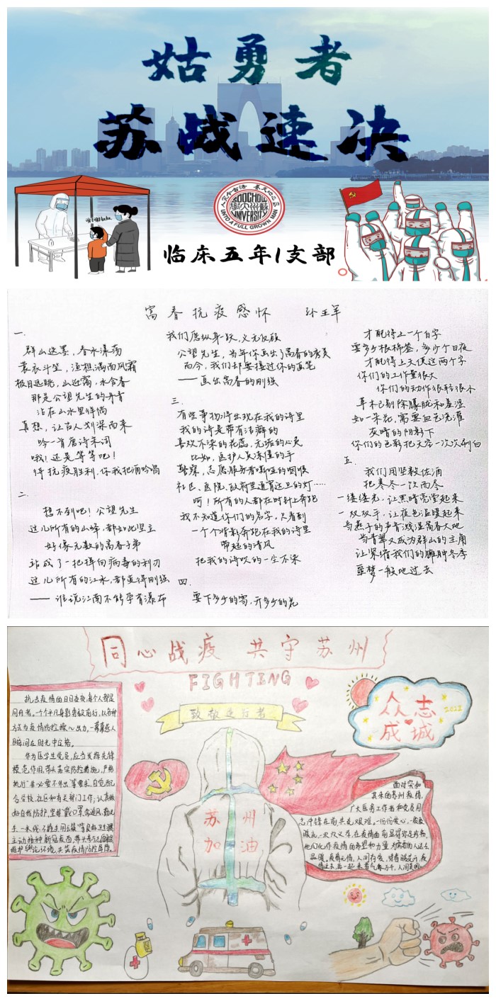 2022年的中国,“十四五”开局良好,正处在“两个一百年”奋斗目标历史交汇点,向着中华民族伟大复兴的中国梦迈出坚定的关键步伐。而连日以来的苏州疫情也牵动着每一个人的心。为了让每一位支部党员同志进一步感受后疫情时代党员先行的自觉和学医的使命感和责任感,本科生临床五年1支部组织全体党员以书画手抄报和原创诗歌创作的形式为苏州疫情防控加油鼓劲,也借此期待苏州疫情能消弭在这春暖花开的时节。