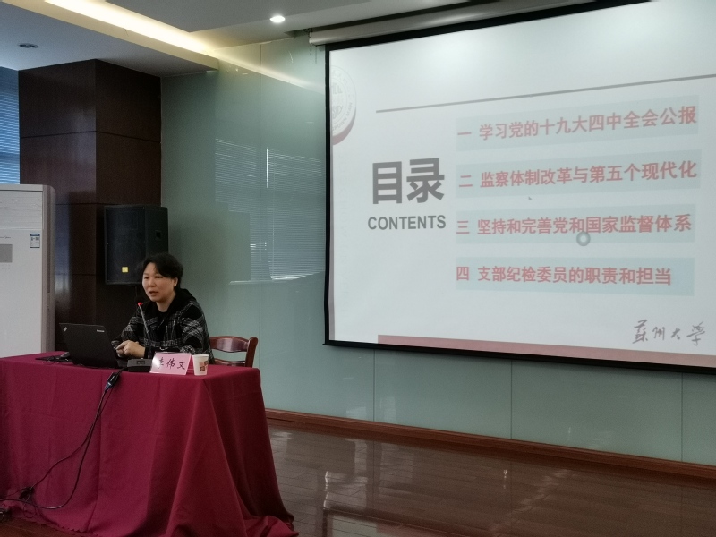 接着,医学部纪工委李伟文书记以《学习领会四中全会精神、纪检委员工作任重道远》为题为全体人员作培训报告。医学部纪工委书记李伟文从《中共中央关于坚持和完善中国特色社会主义制度、推进国家治理体系和治理能力现代化若干重大问题的决定》中两大“奇迹”、“13条显著优势”,引导大家深刻理解中国特色社会主义道路自信、理论自信、制度自信、文化自信的基本依据;从全面从严治党历史进程阐述国家纪检监察体制改革的重大意义;从落实“监督保障执行、促进完善发展”十二字方针,强化提高制度执行力,加强制度执行的监督,切实把我国制度优势转化为治理效能等三个方面宣讲了全会精神。同时,对纪检干部的职责和和必备的知识素养进行详细阐述。要求每位纪检委员必须熟悉党的作风、党的纪律、党内监督、廉洁自律、法规条例等主要知识,承担起支部纪检委员的职责和担当,发挥纪检监察工作在全面从严治党中的重要作用。
