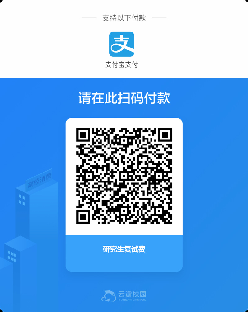 1、 缴纳复试费:80元/人。请在复试前通过支付宝扫码缴费。